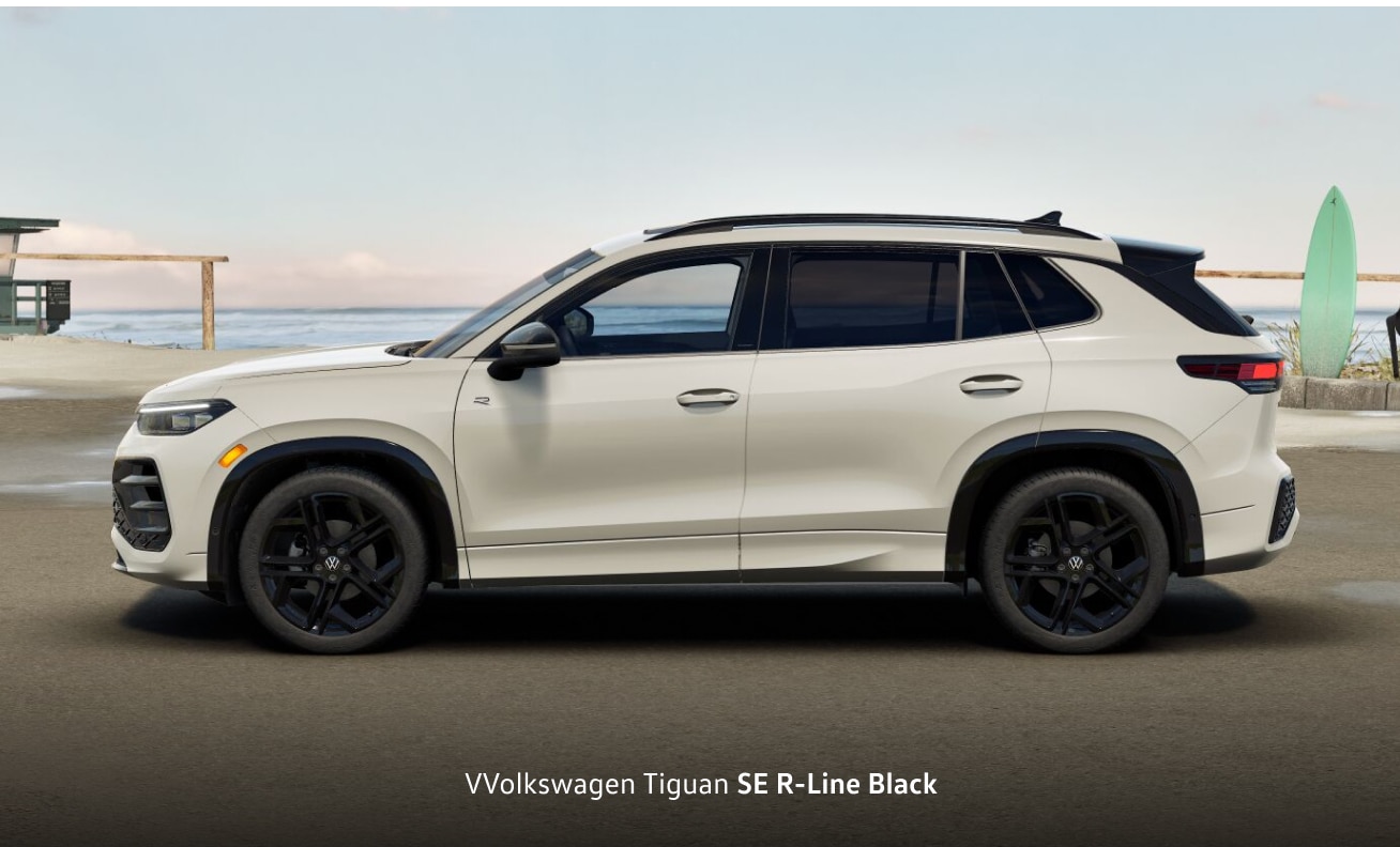 - 2026 Volkswagen Tiguan SE R-Line Black: Amp up your exterior styling in the SE R-Line Black, which features R-Line bumpers, side sills, and badges. Inside, an R-Line perforated sport touch steering wheel and black headliner come standard.